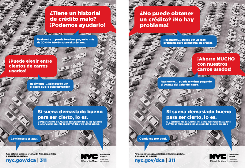 Pro kampaně veřejné služby často stačí přímé překlady a konzistentní formátování. Cílem je jasná, přímá komunikace. Například město New York spustilo reklamu na boj proti predátorským půjčkám s téměř identickou anglickou a španělskou verzí. Takové kampaně prospívají srozumitelnosti a univerzálnosti.